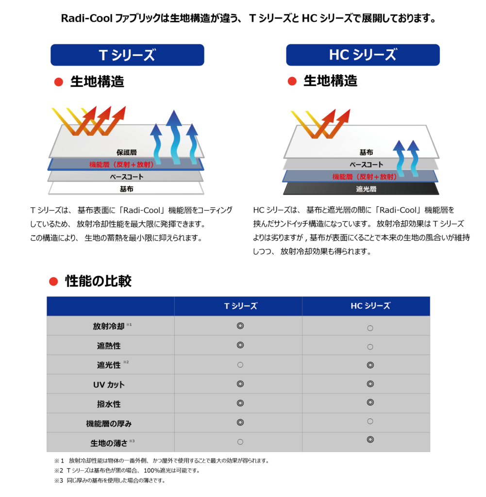 本製品は、Radi-Cool ファブリックの中でも、放射冷却性能を最大限に引き出す「T シリー