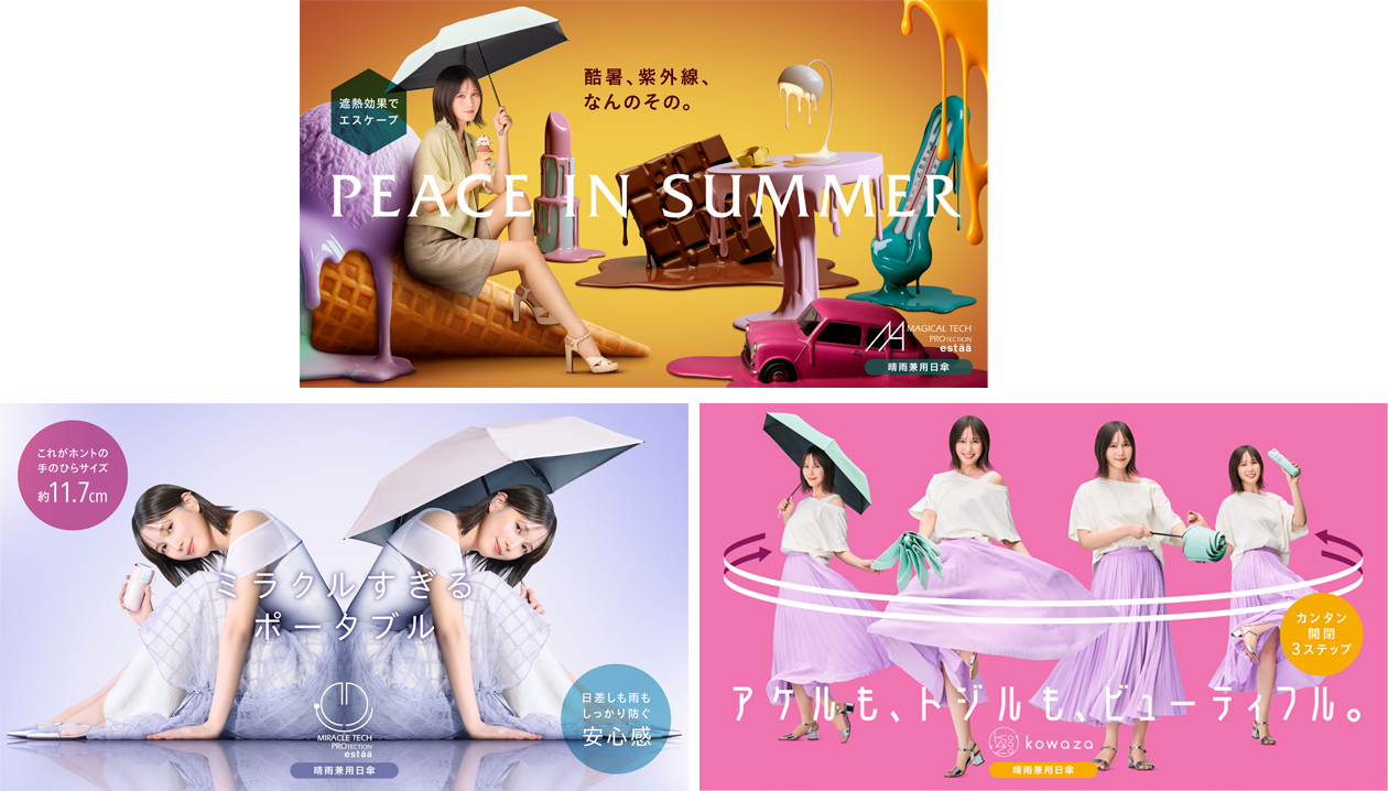 今年の「マジカルテック プロテクション」は、世界最軽量級のシリーズに加え、軽さと強さを両立した「タフシリーズ」 が新登場。Wカーボン骨や12本骨構造により、日常使いしやすい軽さはそのままに、よりしなやかで丈夫なモデルへと進化しました。キービジュアルに掲げたメッセージの「PEACE IN SUMMER」には、酷暑や紫外線、突然の雨といった夏の不快要素を軽減し、傘を通して快適で涼やかな時間を提供したいというメッセージを込めています。また、ミラクルテックは世界最小級の小ささの携帯性はそのままに遮光機能を持たせた「ミラクルテック プロテクション」が仲間入り。kowaza は、更にたたみやすくなった軽量でスリムな新シリーズを加えアップデート。日差し・雨・風など多様な天候に対応できるラインナップとして展開いたします。