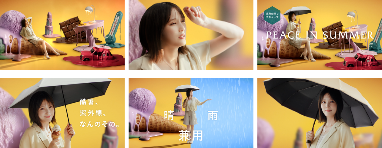 夏の強い日差しの中、思わずまぶしさに目を細める本田さん。周囲ではチョコレートやアイスクリームがゆっくりと溶け出し、“酷暑の世界”が広がる中で、ふと彼女の視線の先に映るのが「マジカルテック プロテクション」。本田さんが日傘を手に取り広げた瞬間、その場の空気がふっと変わるように、遮熱効果によって日差しが和らぎ、表情は一転して涼しげな表情へ。「酷暑だって、紫外線だって、なんのその。」というナレーションには、強い日差しも紫外線もこの一本で“受け流せる”という軽やかな世界観が込められています。続くカットでは、雨粒が画面を濡らす中、本田さんが少し弾むような足取りで歩きながら「雨の日だってなんのその。」と語り、晴雨どちらの天気でも寄り添う日傘の万能さを印象的に描き出します。