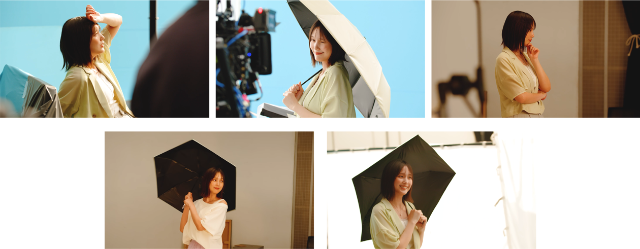 撮影は都内近郊のスタジオで行われました。本田さんはミントグリーンのジャケットにショートパンツという爽やかな衣装で登場。最初にマジカルテック プロテクションを手にした瞬間、「軽っ!」と思わず声がこぼれ、自然体の笑顔を見せていました。カメラが回ると、日傘を開いたり持ち歩いたりする動きを丁寧にこなし、今回のシリーズが持つ、軽さと扱いやすさをのびやかに表現しました。続く「kowaza」では、オフショルダーのTシャツと動きの出るロングスカートに衣装を替え、軽快な開閉動作をテンポよく撮影。本田さん自身のアイデアで“スカートの揺れと日傘の動きを合わせる”カットも追加され、軽やかな動作と衣装のラインがリンクする印象的なシーンとなりました。